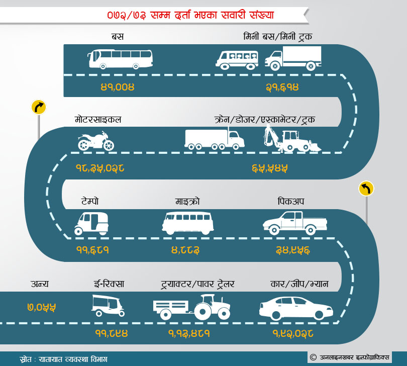३४ हजार ९ सय ५६ थान पिकअप, ४ हजार ८ सय ८३ थान माइक्रो, ११ हजार ६ सय ८१ थान टेम्पो, १८ लाख ३५ हजार २८ थान मोटरसाइकल, १ लाख १३ हजार ४ सय ८१ थान ट्रैक्टर तथा पावरटेलर, ११ हजार ८ सय ९४ थान इ-रिक्सा र ७ हजार ५५ थान अन्य प्रकृतिका गाडीहरु दर्ता भएका छन् ।